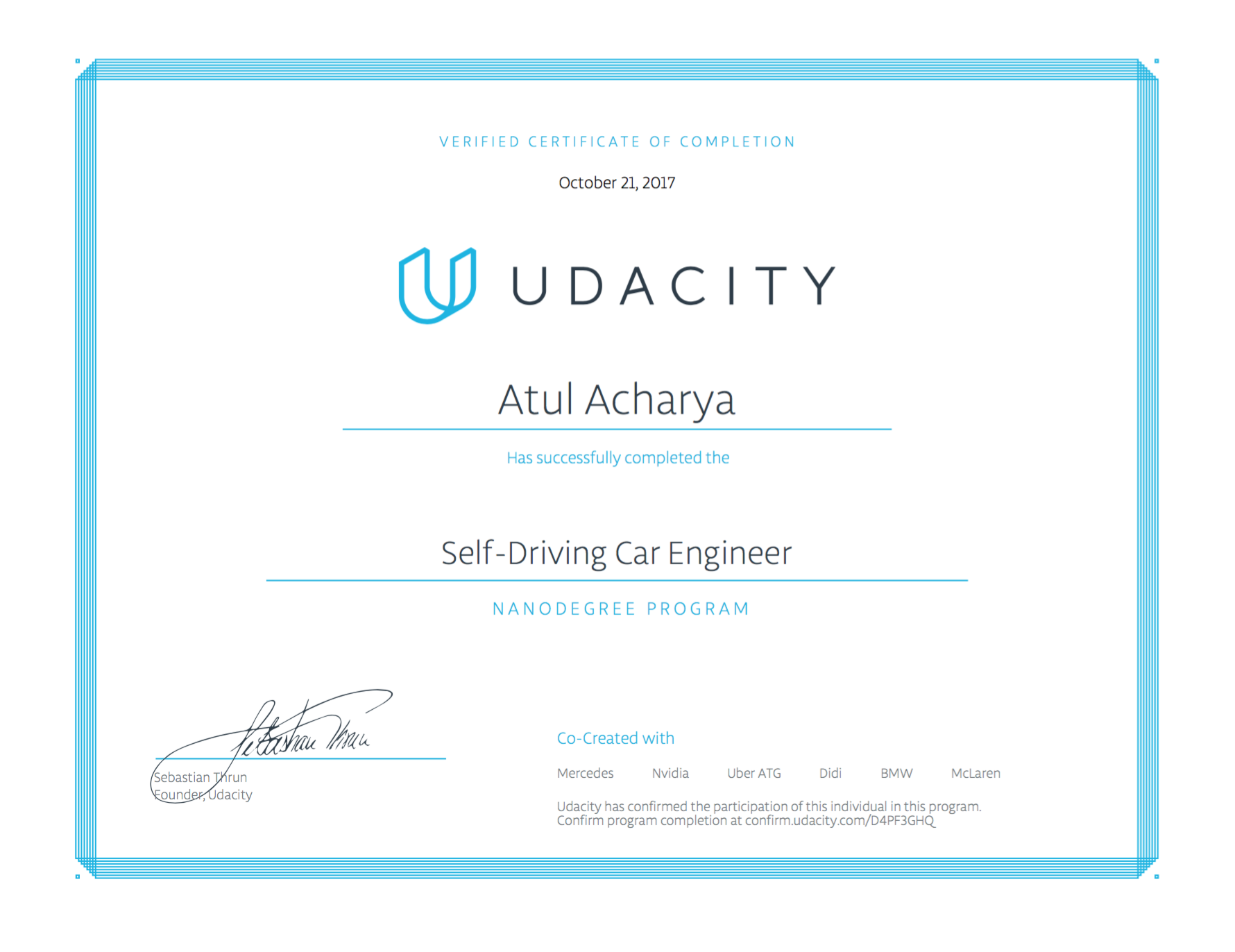 Just a quick note to say, I’ve completed Udacity’s Self-Driving Car Nanodegree in its inaugural cohort. 👍👍